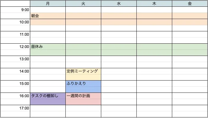 一週間のスケジュールは次のようになります。お客様との定例ミーティングを中心にイベントを集めています。