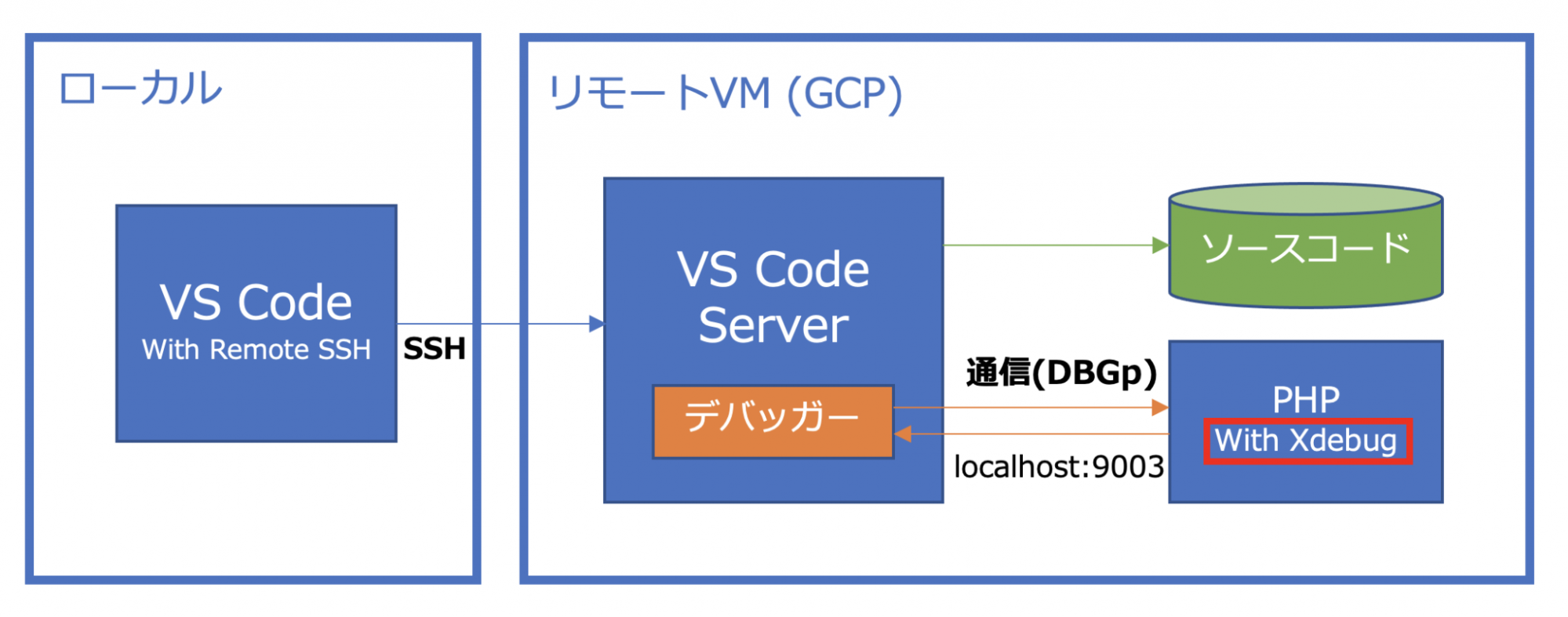 (詳細については後述しますが、Xdebugが有効になっているPHPは、実行時にここで指定したホスト・ポート宛にDBGpというプロトコルを用いて接続を試みます。その為、ホスト・ポートは接続を待ち受ける側(クライアントのホスト及びIDEで解放するポート番号)の情報を設定する必要があります。今回の例に関しては、Google CloudのVMインスタンス内のPHP・IDE間で通信する想定なのでホストはlocalhostとしています。ポートについてはIDEで設定する値と合わせておけば良いので、9003以外の値でも問題ありません。今回はVSCodeでのステップ実行を想定しているため、VSCodeデフォルトの9003番を指定しています。)