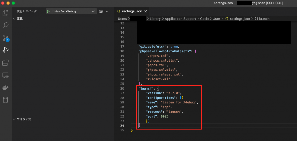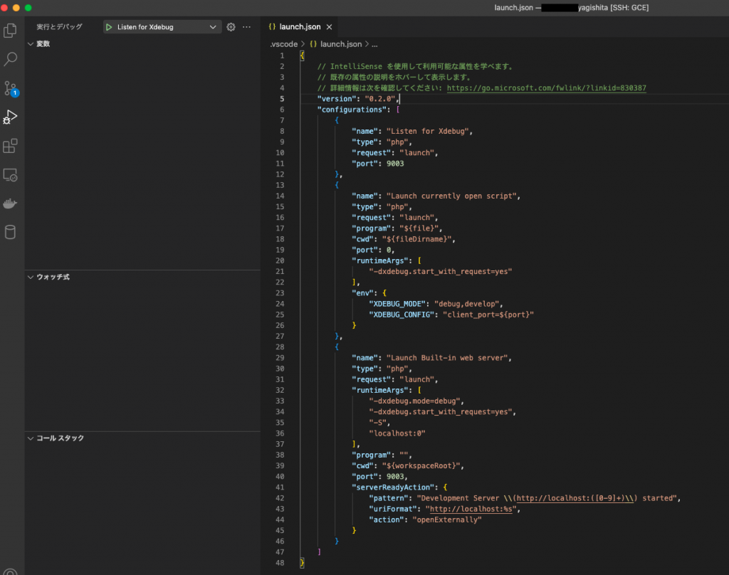 // 省略 基本的にはデフォルトで作成されるListen for Xdebugを使用すれば問題ないかと思いますが、portが他のサービスと重複している場合などあれば適宜変更してお使いください。(launch.jsonのドキュメント)