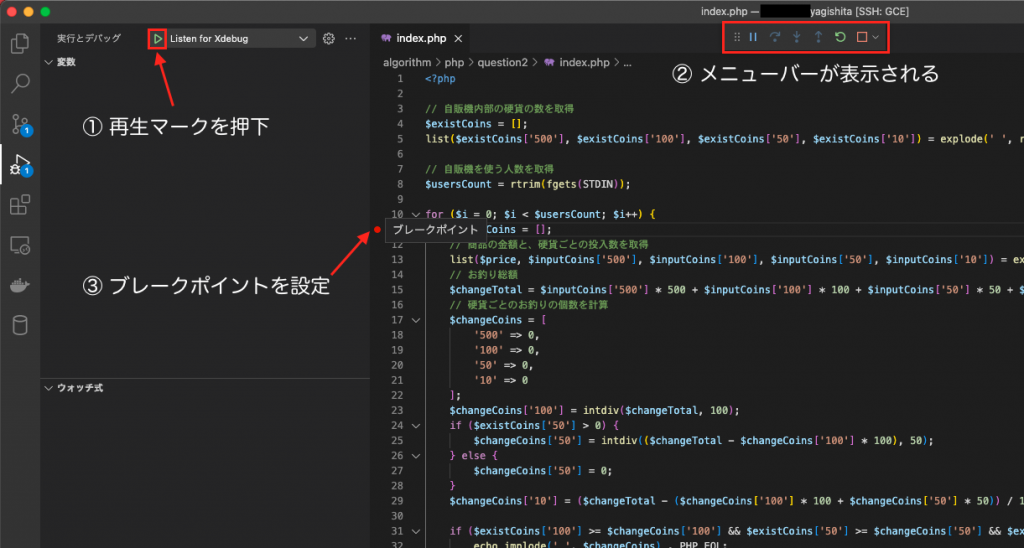 するとあら不思議!プログラムがブレークポイントで一時停止し、該当の行がハイライトされます。この時、実行とデバッグの上部、変数メニューでは該当行実行時に定義されている変数の中身を確認することができます。var_dumpで個別に確認していたこれまでの自分とはおさらばしましょう!