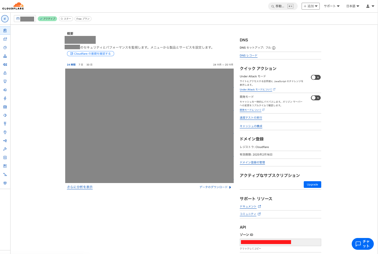 Cloudflare のドメインの概要画面で、右下の方に「API」という項目があります。ここからゾーン ID をコピーしてください。
