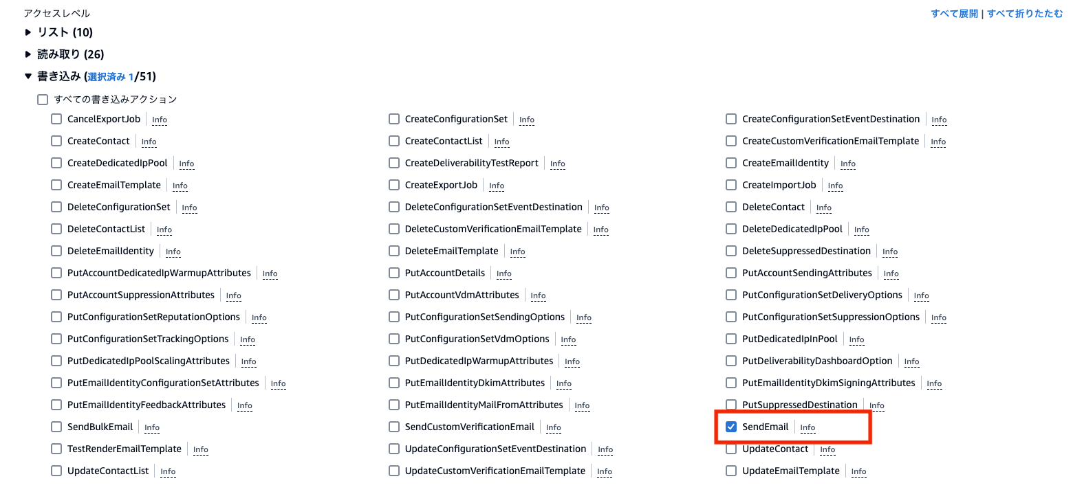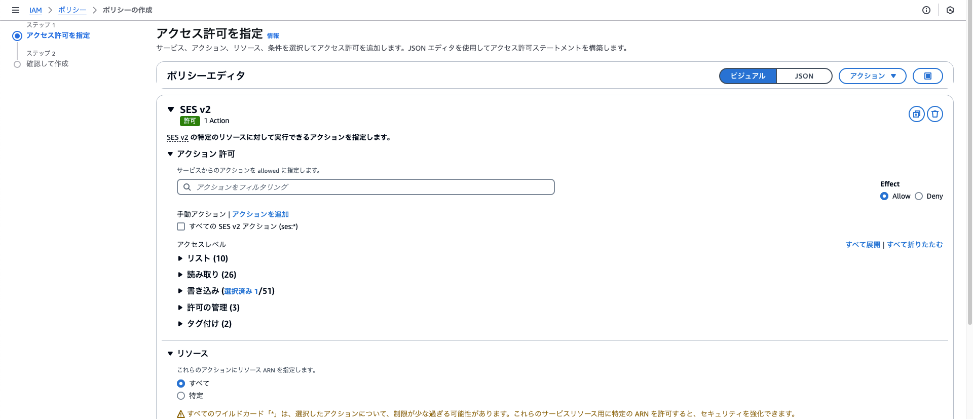 まずはじめに、LambdaでAmazon SESのAPIを利用してメール送信を実行できるようにするため、IAMポリシーと実行ロールの作成を行います。