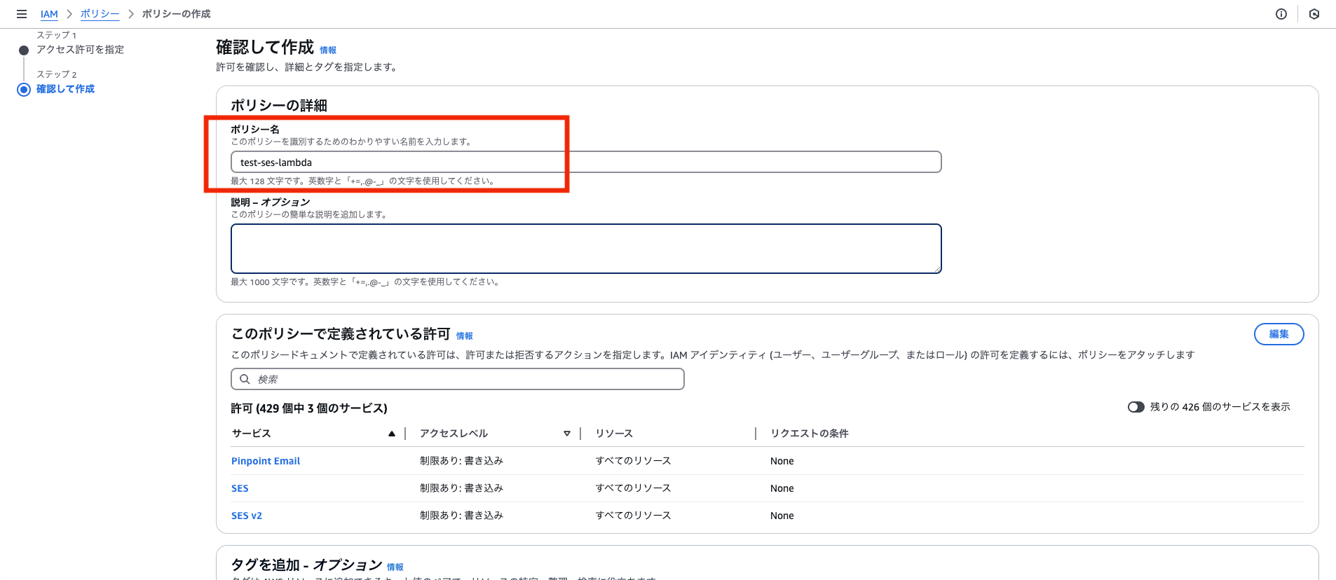 「次へ」ボタンを押し、任意のポリシー名を入力します。今回は「test-ses-lambda」というポリシー名で作成しました。オプションで必要な設定があれば適宜追加してください。