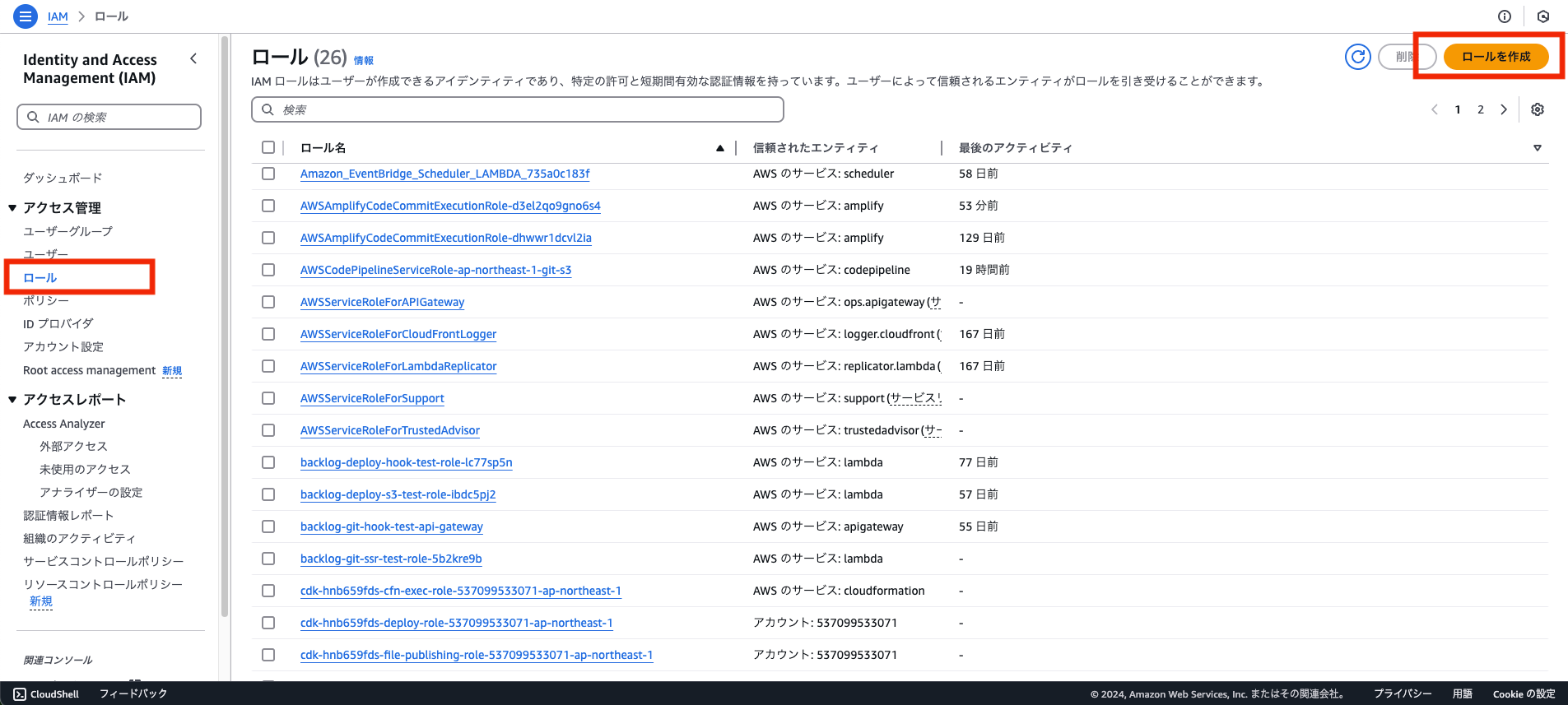 続いてLambdaに割り当てる実行ロールを作成し、先ほど作成したIAMポリシー「test-ses-lambda」をアタッチします。こちらもIAMコンソールから設定します。