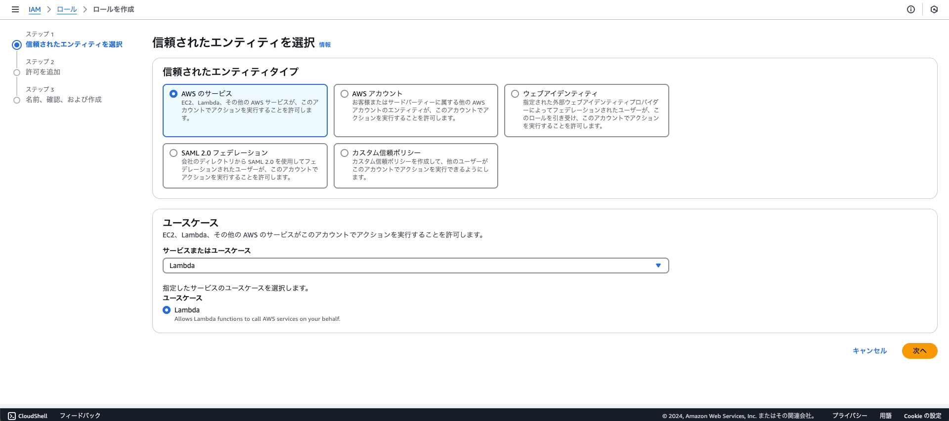 AWSのコンソールにサインインし下記の通りに進み、設定を行います。