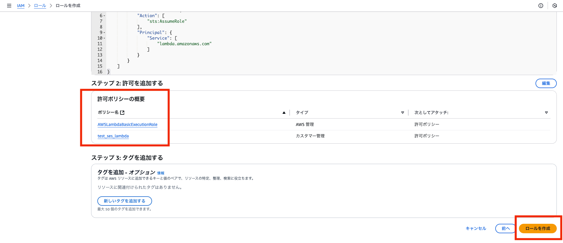 「許可ポリシーの概要」で「test-ses-lambda」と「AWSLambdaBasicExecutionRole」が追加されていることを確認し、「ロールを作成」ボタンを押します。これでIAMポリシーと実行ロールの作成は完了です。