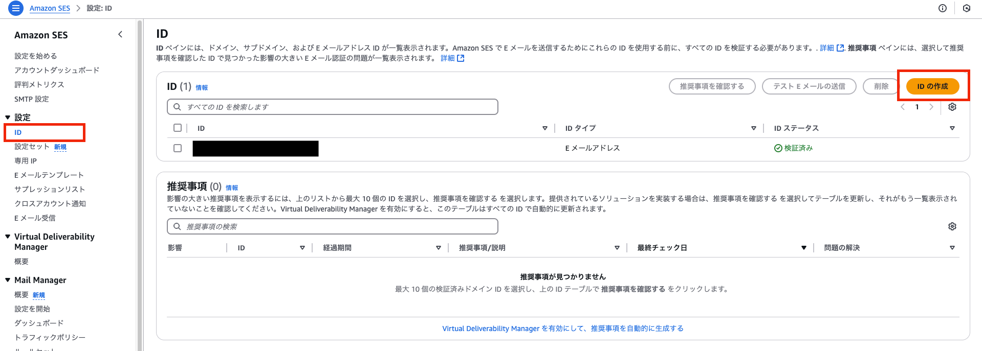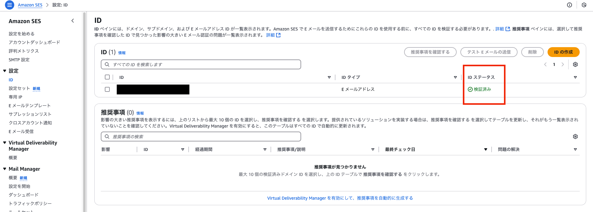 設定: ID画面で追加したメールアドレスのIDステータスが「検証済み」になっていたらSESの設定は完了です。(受信用と送信用のメールアドレスを分ける場合は別のメールアドレスでもう一度この作業を行ってください。)