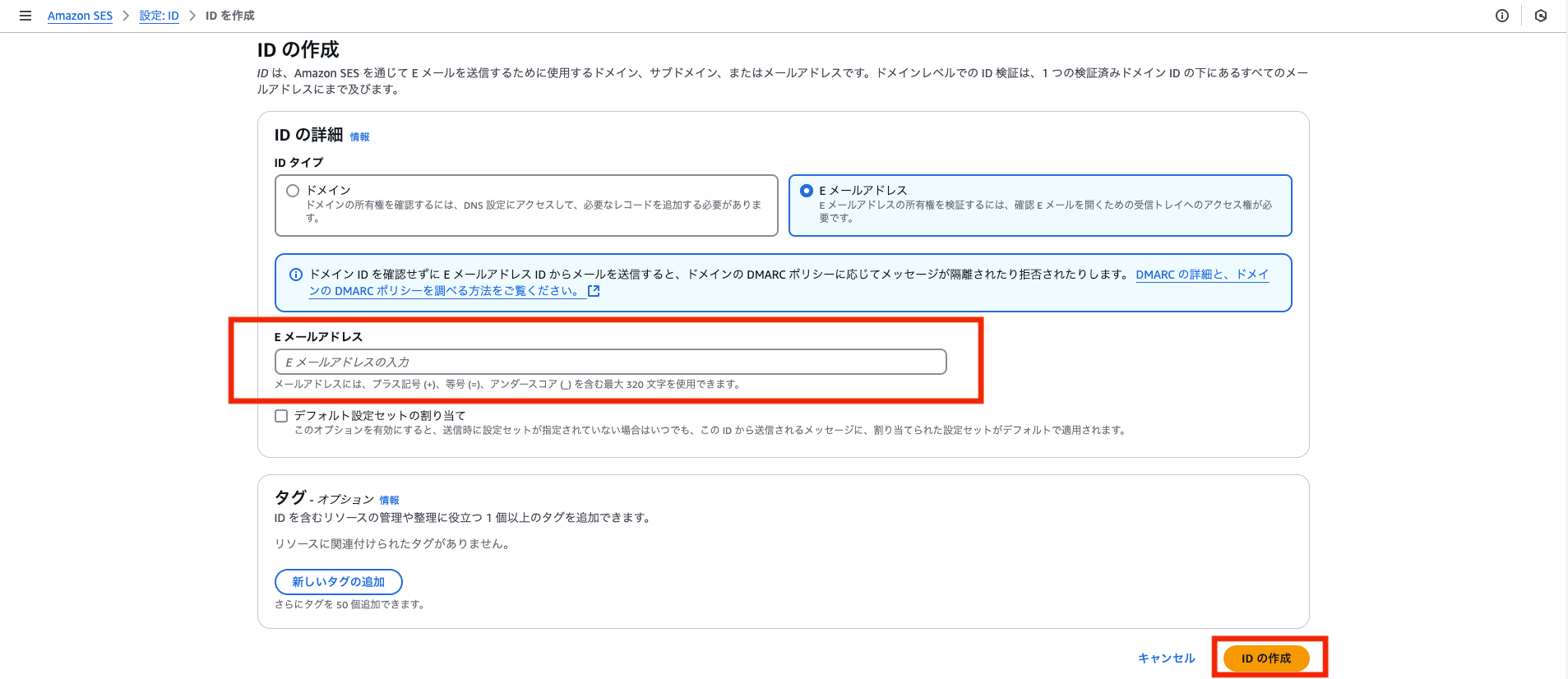 SESでメール送信を行うためにはIDを設定する必要があり、IDはドメインもしくはEメールアドレスで作成することが可能です。簡単な方法はEメールアドレスでIDを作成し検証することですが、EメールアドレスIDでは送信ドメイン認証(SPFおよびDKIMの設定)ができずDMARC認証を機能させることができません。そのため、メールサービスによっては送信したメールが受信拒否されることや迷惑メールに振り分けられることになる可能性があります。