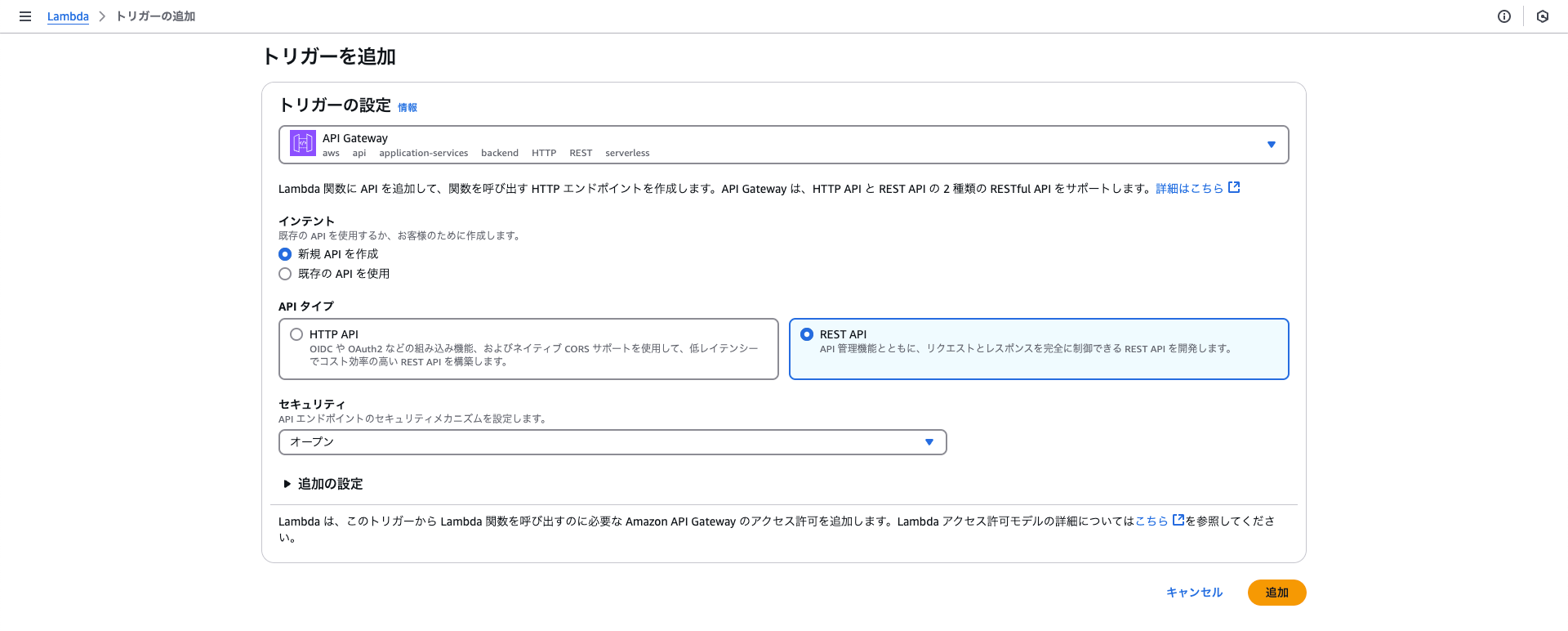 「追加の設定」からAPI名やデプロイされるステージは任意の値を設定し、「追加」ボタンを押します。