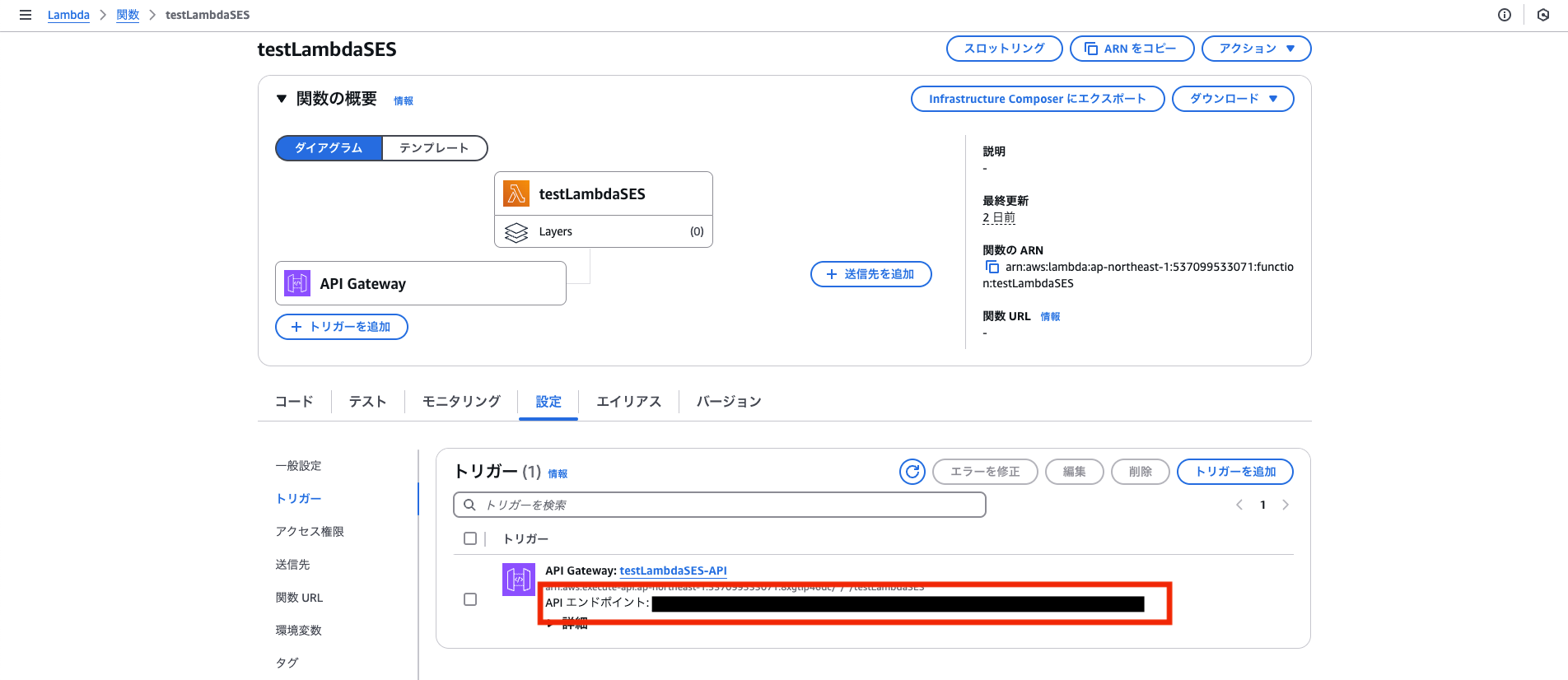 LambdaにAPI Gatewayのトリガーが追加され、APIエンドポイントが発行されます。