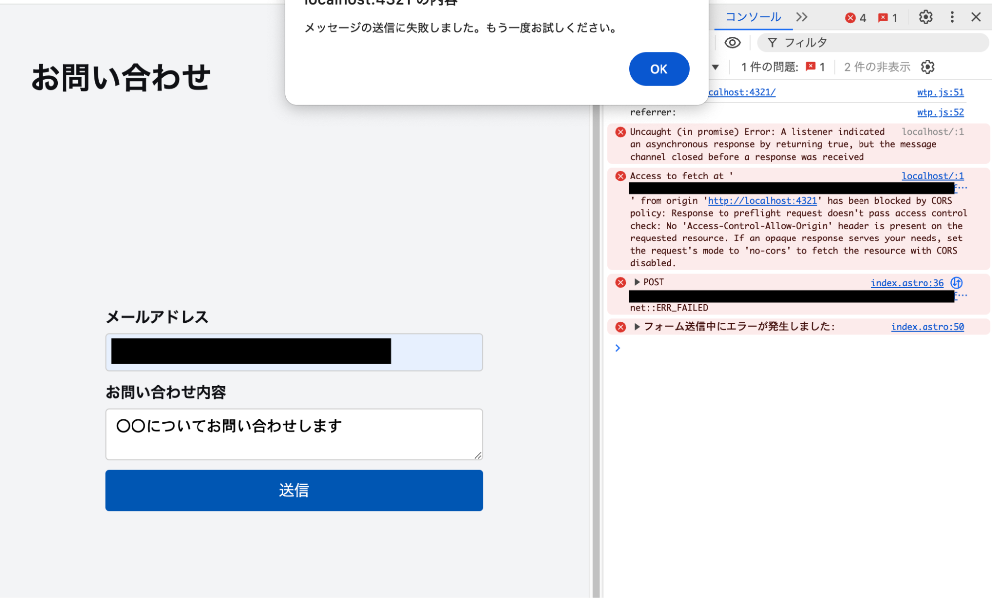 ここまで設定し再度お問い合わせを送信しても、リクエストはまだCORSポリシーによりブロックされてしまいます。
