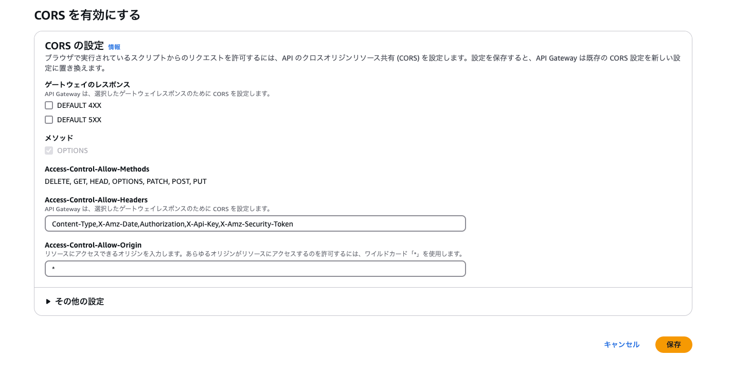 ②さらに、シンプルリクエストではない場合はAPI Gatewayの統合タイプに応じてCORSサポートを有効にする必要があります。