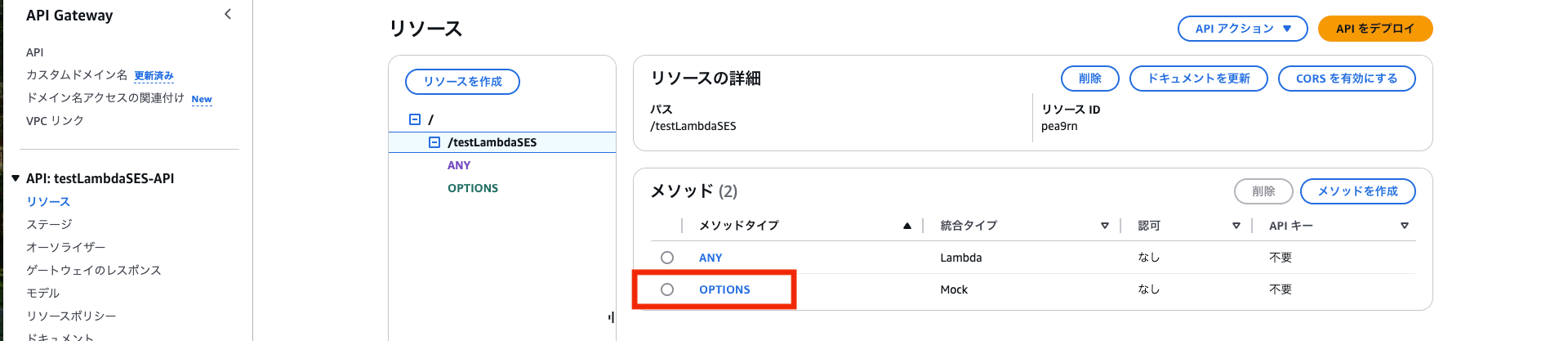 今回はAPI Gatewayのエンドポイント(https://〇〇〇.execute-api.ap-northeast-1.amazonaws.com/default/testLambdaSES)に対してlocalhost:4321という別のドメインからリクエストを行うためCORSを有効にする必要があります。