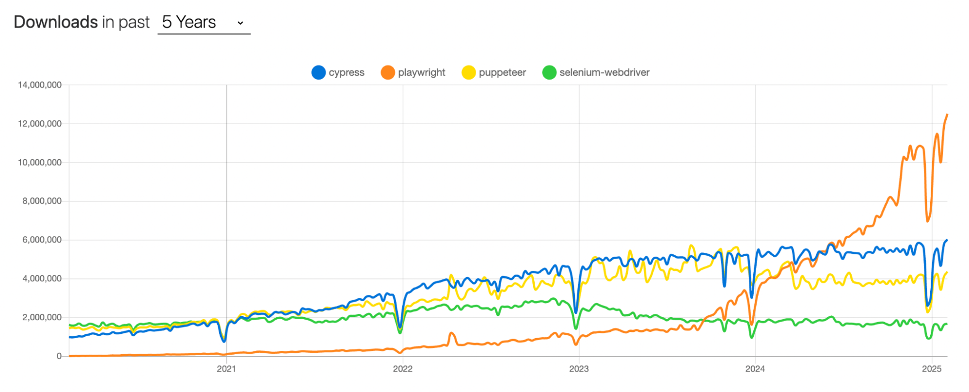 ダウンロード数のトレンドは昔はCypressなどのE2Eテスト自動化ツールより少ないですが、