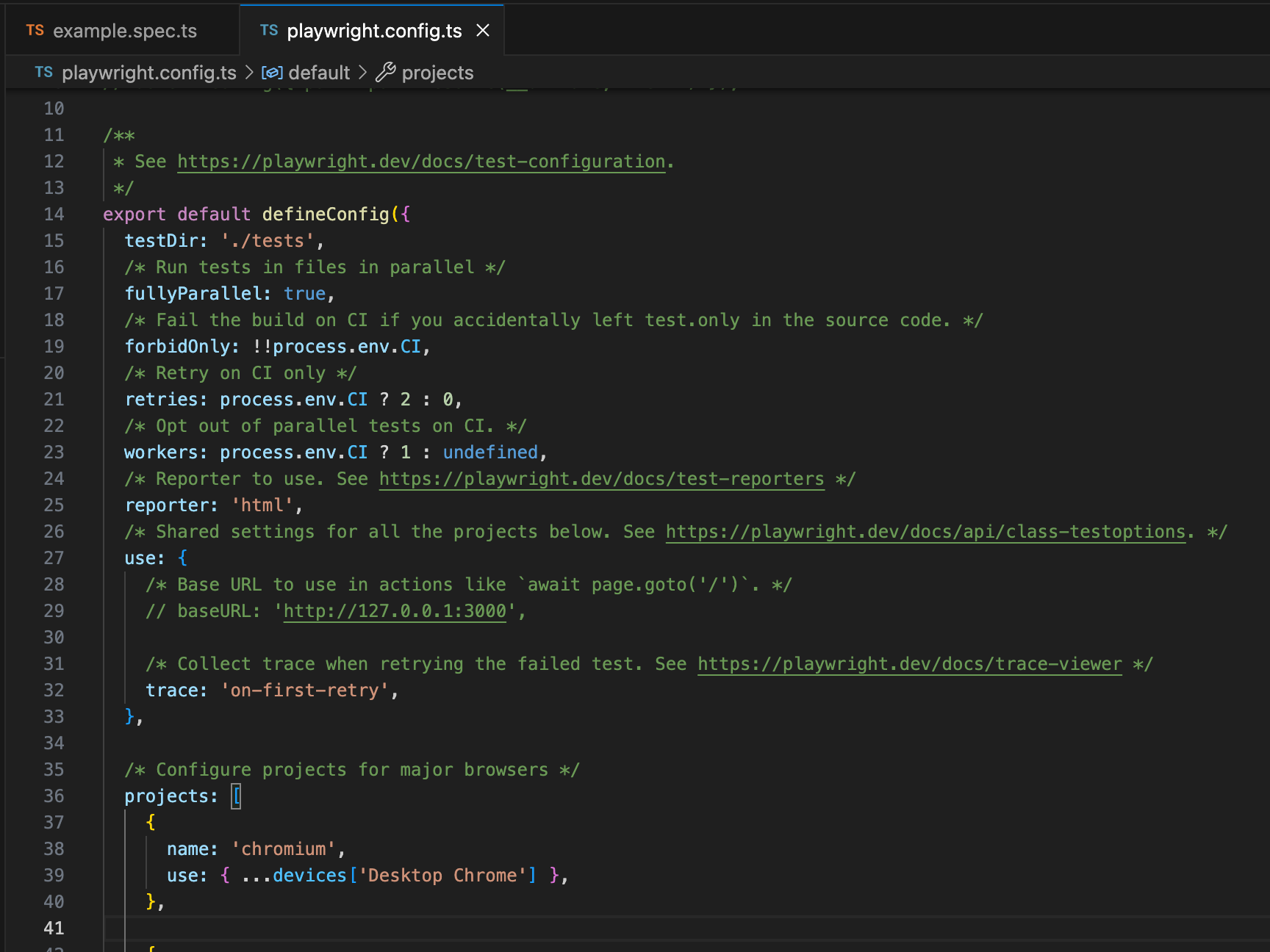 - projects:テストを行う環境(chromium、webkit、Mobile Chromeなど)の設定をします。