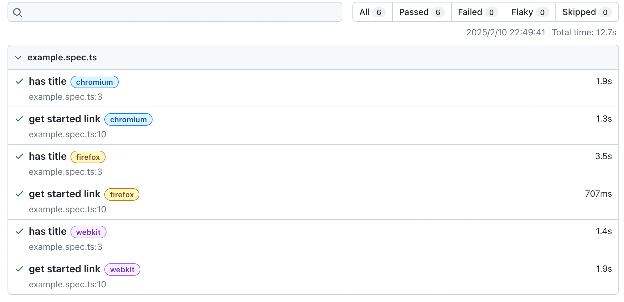 npx playwright testテストコードの作成後、上記のコマンドを叩くとテストが実行されます。