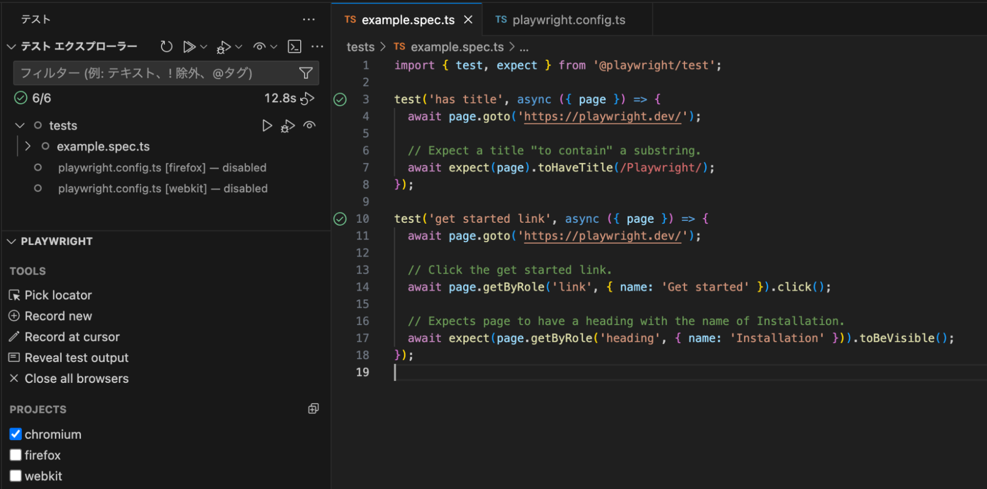 この拡張機能を使うと、playwright.config.tsで設定した内容を元にUI操作でテストの動作設定をしたり、コマンドを叩かずVSCodeの中でテストを直接実行することができます。