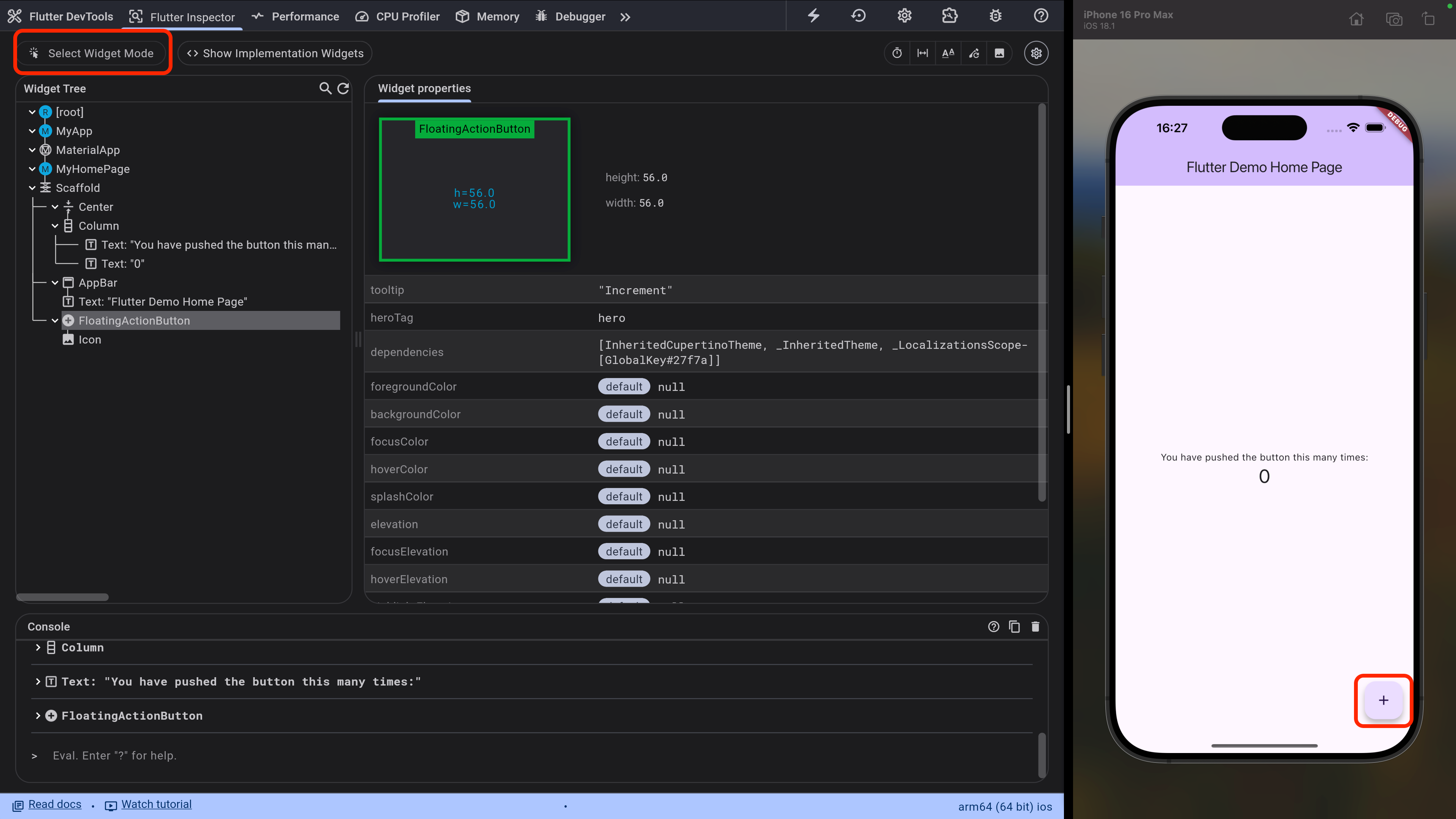 Flutter Inspector タブの「Selcted Widget Mode」ボタンをクリック後、アプリ画面で確認したい部分をタップするとWidgetの状態を確認できます。