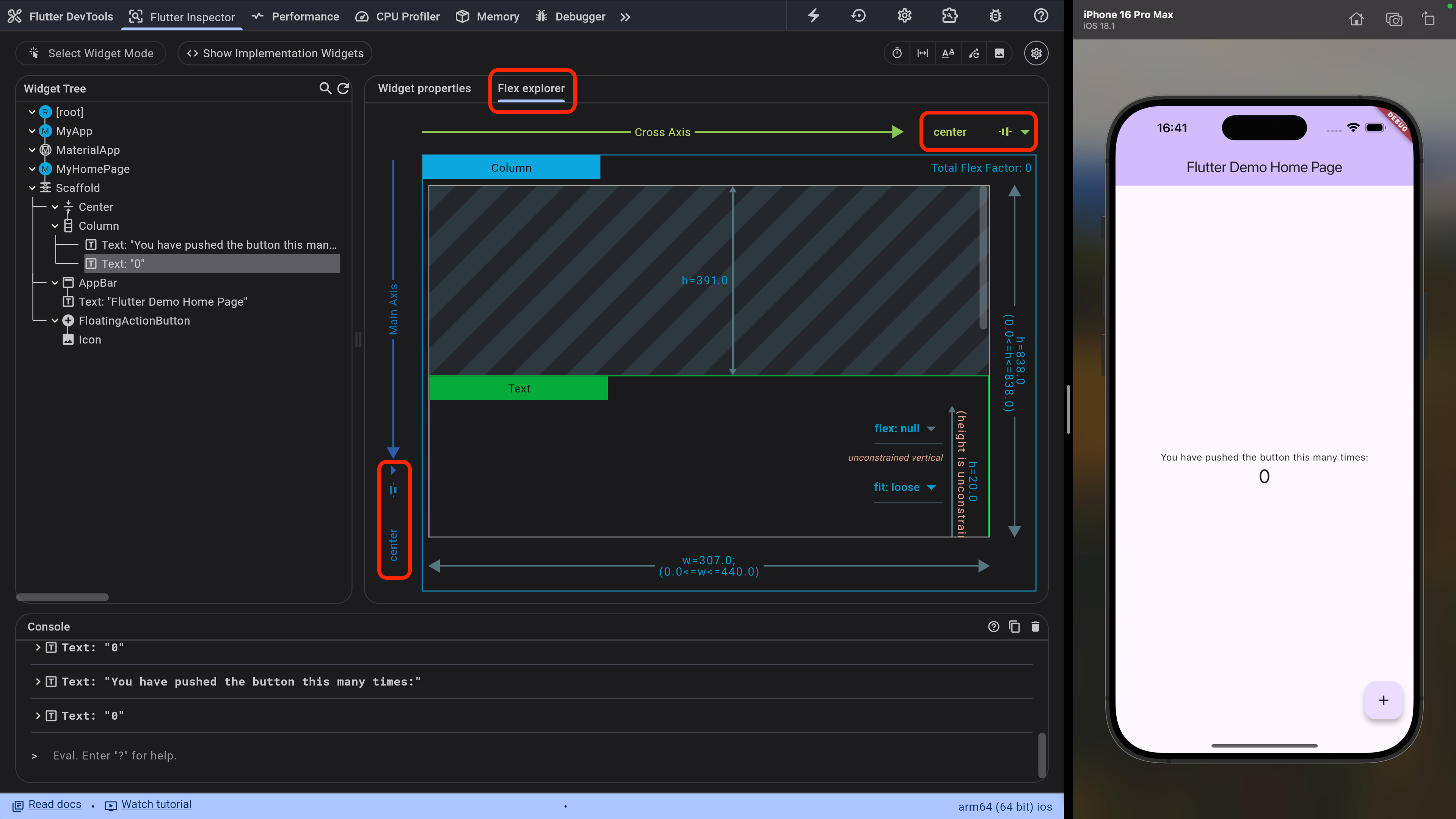 Widgetによっては右側に表示されるタブが増えることがあります。例えば以下の画像のようにColumn、Row、Flexやその子要素を選択している場合は Flex explorer タブが追加され、mainAxisAlignment、crossAxisAlignmentのパラメータをリアルタイムに変更したり、兄弟要素の位置関係を視覚的に確認することができます。ここで変更したプロパティはコードには自動反映されないのでその点は注意です。