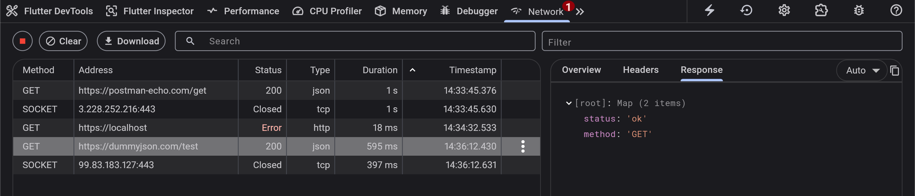 Dartで行なっている通信のみ確認できるという点に注意が必要です。ネイティブ側で行なっている通信は確認することができません。(Swift、Kotlin、JavaScript等で行う通信を指しています。パッケージによってはそれらを使う実装になっている場合があります。)ネイティブ側で行なっている通信を確認する必要がある場合はiOSであればXcodeのInstruments、AndroidであればAndroid StudioのNetwork Inspector、Webであればブラウザのデベロッパーツールを活用することで確認可能です。