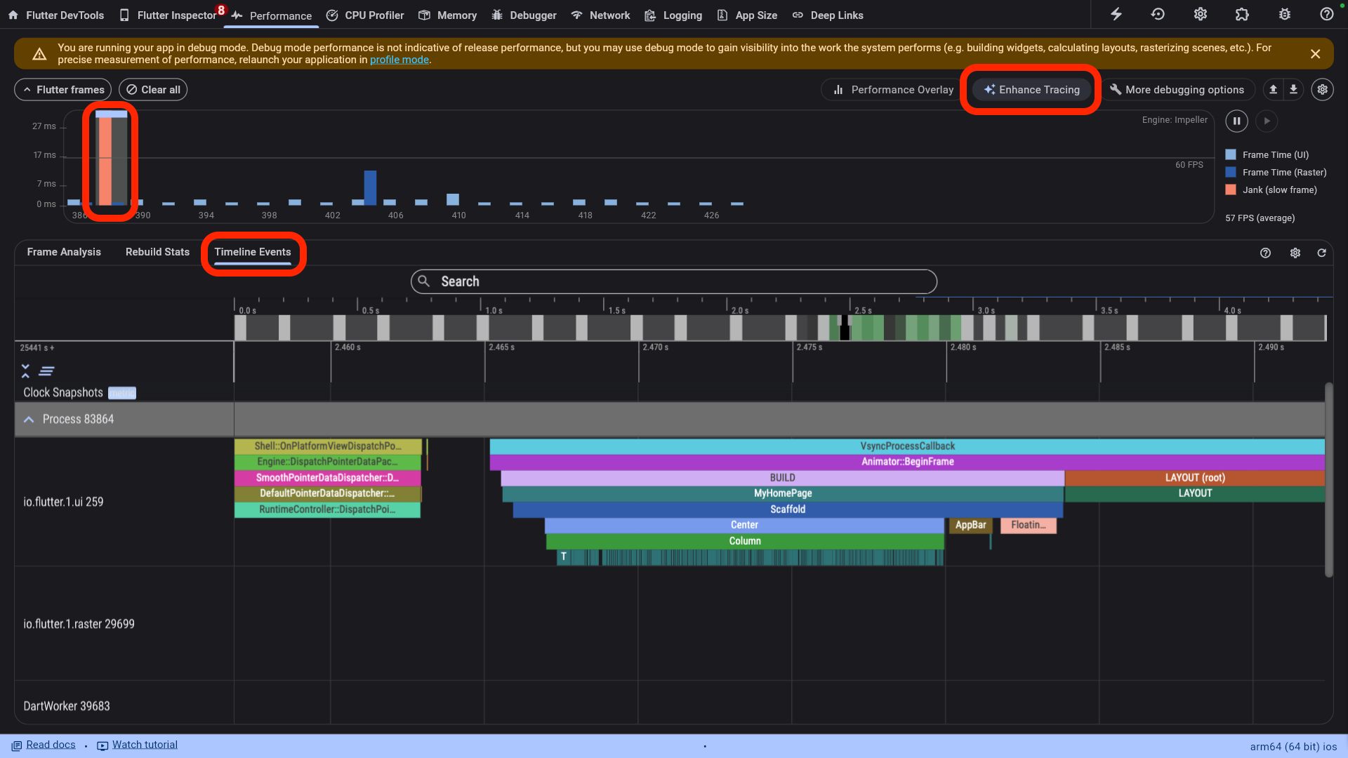 右上のEnhance Tracingで Trace widget builds にチェックを入れた状態で、棒グラフの中でオレンジになっているところをクリックし、Timeline Eventsを開くとどのWidgetで時間がかかっているかを簡単に確認できます。以下のタイムラインがうまく表示されない時は右上のreloadボタンをクリックしてください。例えば以下の画像だと、「Columnの表示に時間がかかっているな〜」「よく見ると要素数が多いなぁ〜」ということを確認できます。