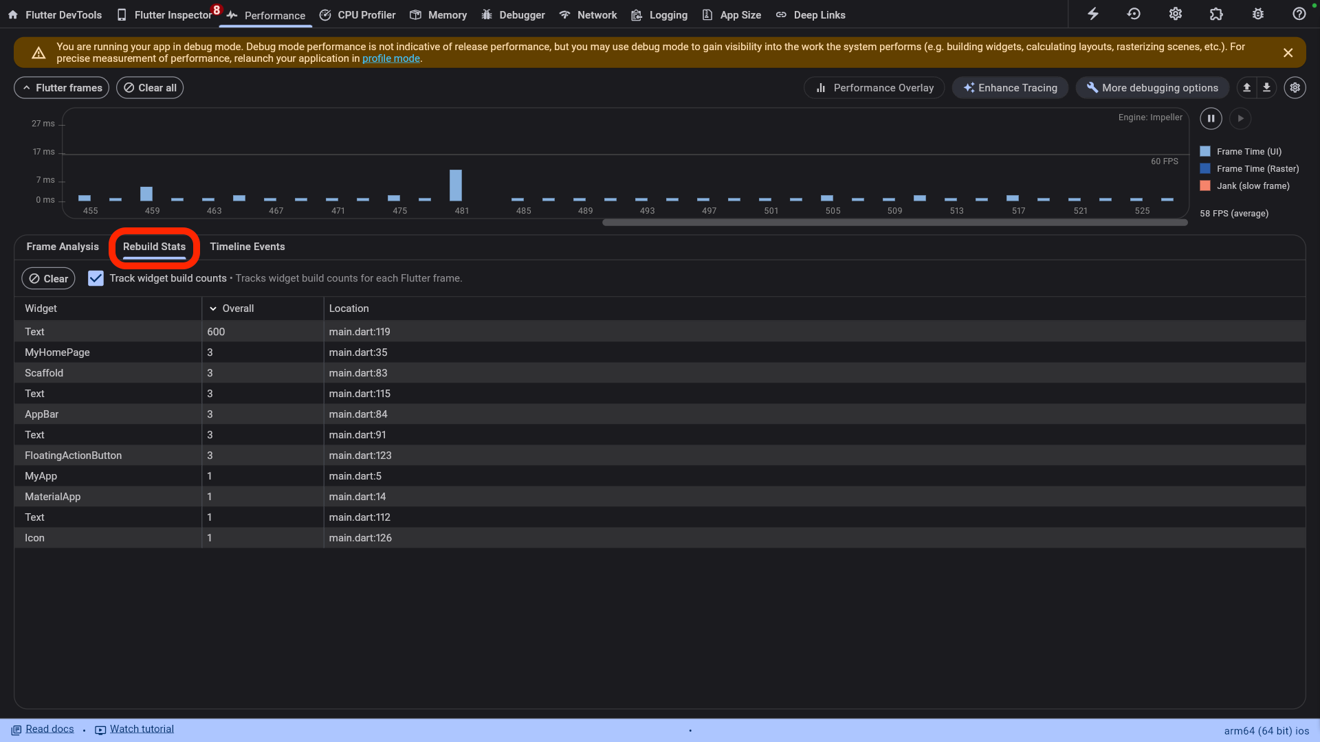 また、頻繁なrebuildもFlutterにおいてパフォーマンス低下のよくある要因です。こちらはTimeline Events の左隣の Rebuild Stats で確認できます。例えば以下の画像では、「Textのrebuild回数が多いな〜」「不要なrebuildであればrebuild範囲を狭めよう!」という形で改善ができます。