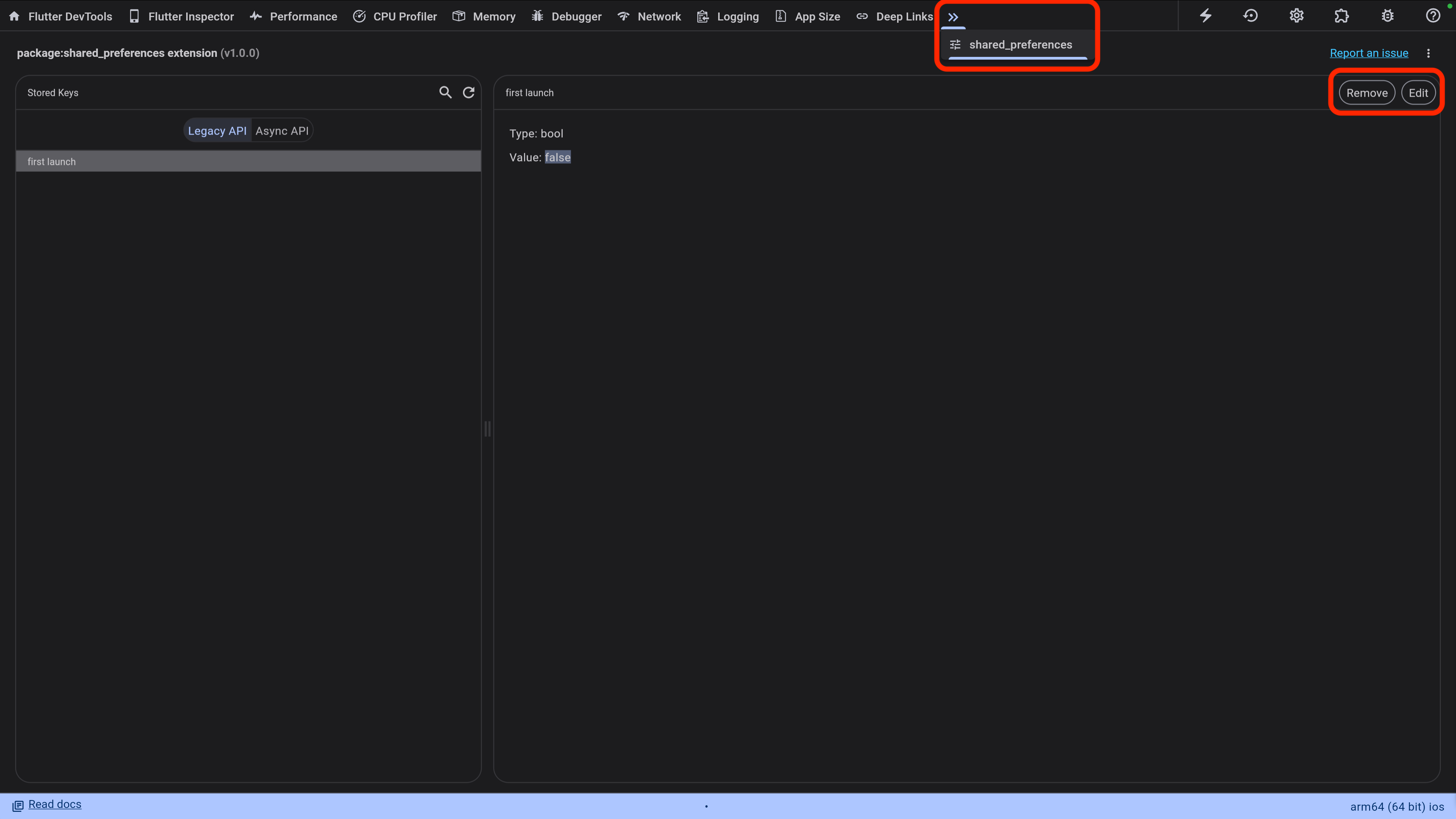 例えばshared_preferencesを使用している場合は、以下画像のようにshared_preferencesタブが追加されて、値の確認、編集等が可能になります。