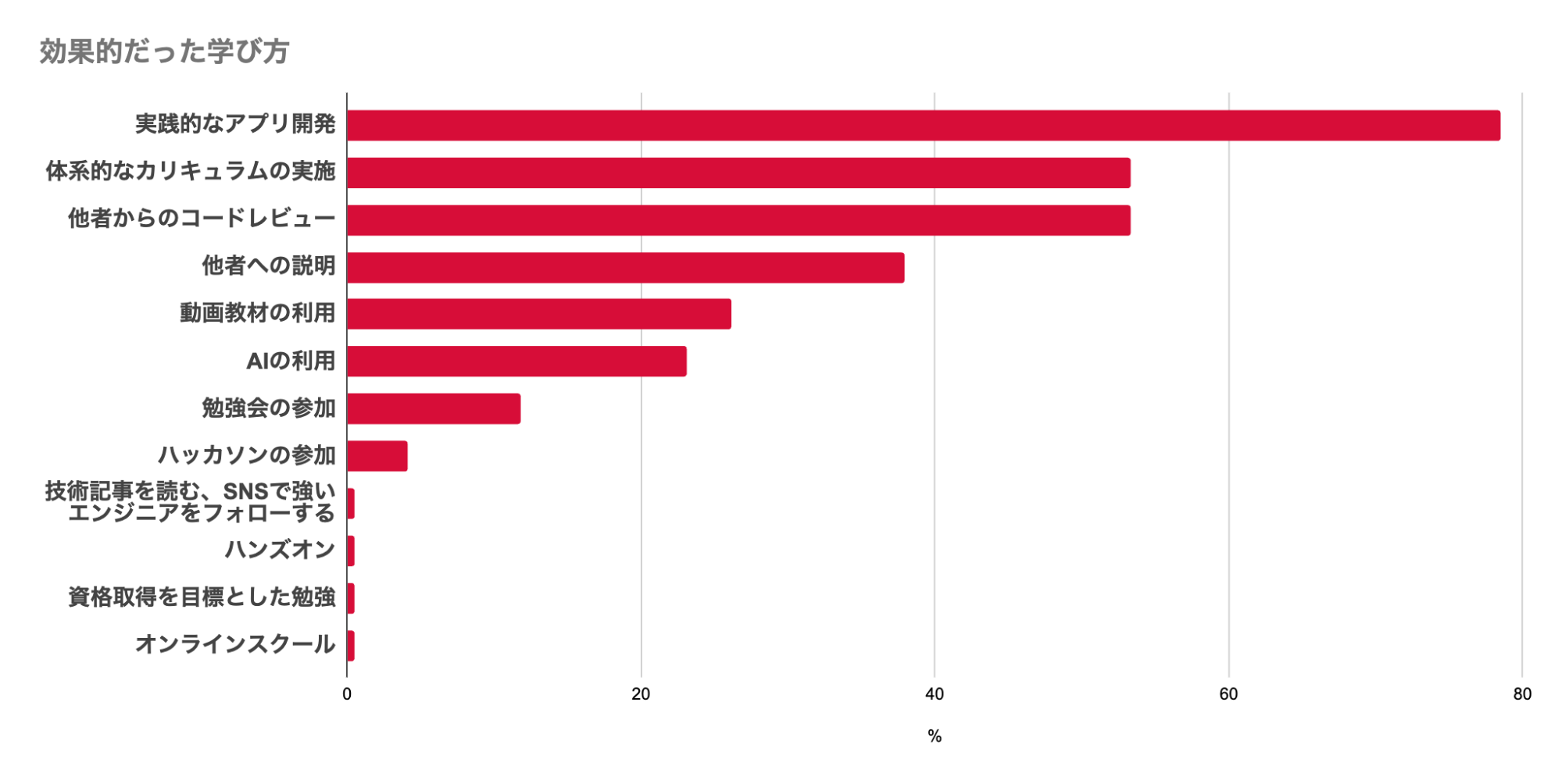 こちらのアンケート結果からは資格取得や動画教材の活用は効果的な学びだと感じられていないことがわかります。