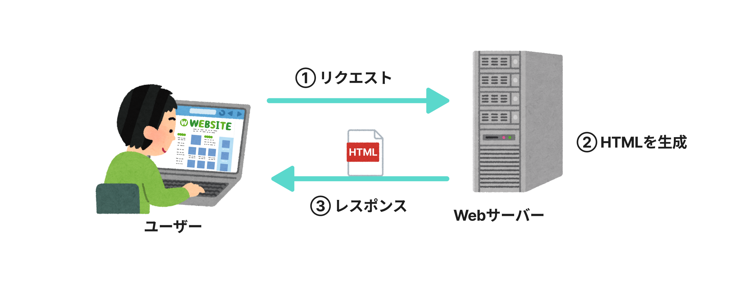 生成されたHTMLがレスポンスとして返却され(③)、ブラウザはHTMLを解析して画面を描画します。