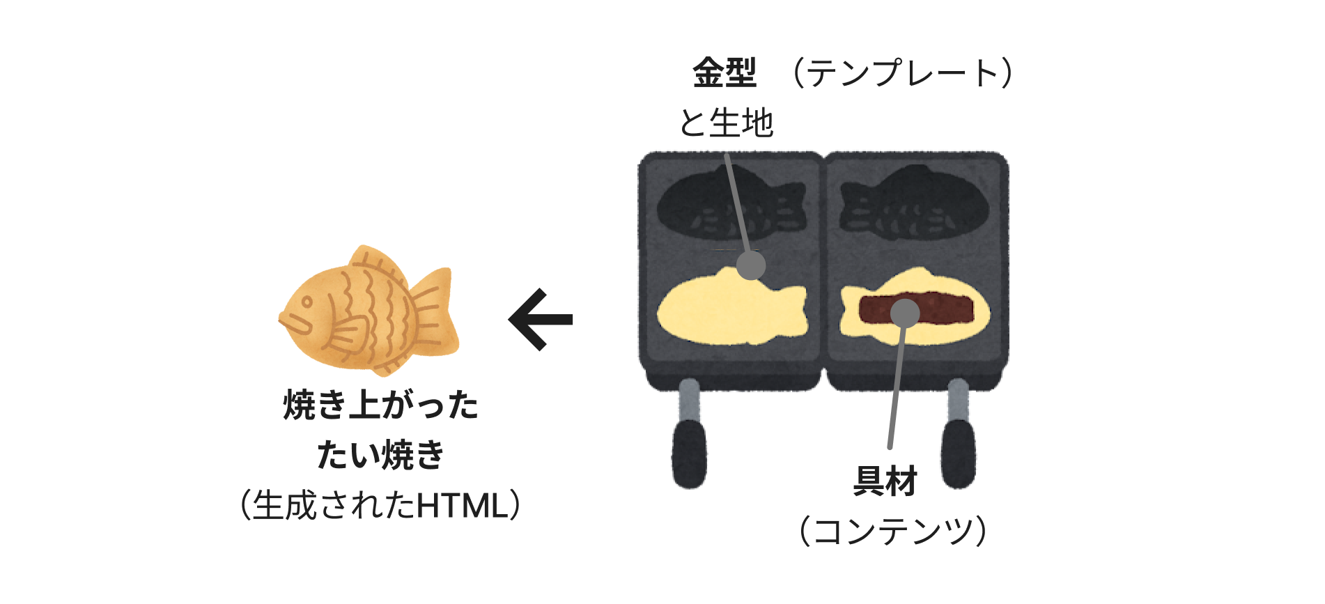 たい焼き自動販売機を運営する会社は、具材工場から送られてきた具材(コンテンツ)と、最新の金型(テンプレート)と生地を使って、あらかじめたい焼きを全種類焼き上げておく製造ラインを持った「たい焼き工場」があります。