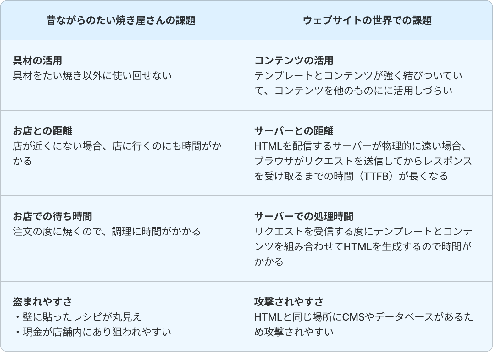 このように役割を分離した上で、ウェブサイトの全ページをあらかじめ生成しておく(=たい焼きを事前にすべて焼いておく)。これが、表示を高速にするための最大の特徴です。
