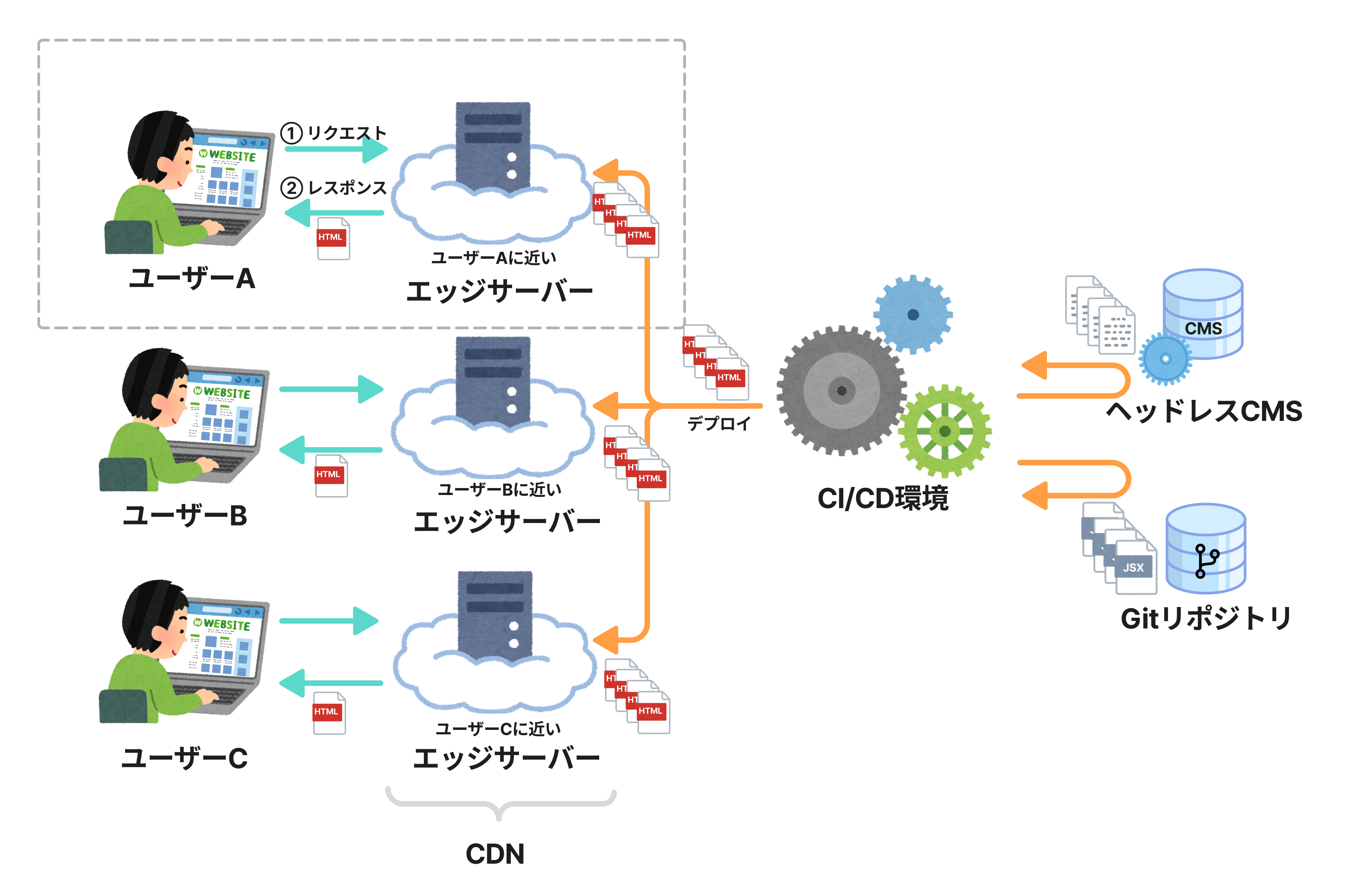 これは新しいウェブサイトの作り方で言うと、事前生成したHTMLが、世界中のCDNに配信されるのと同じです。