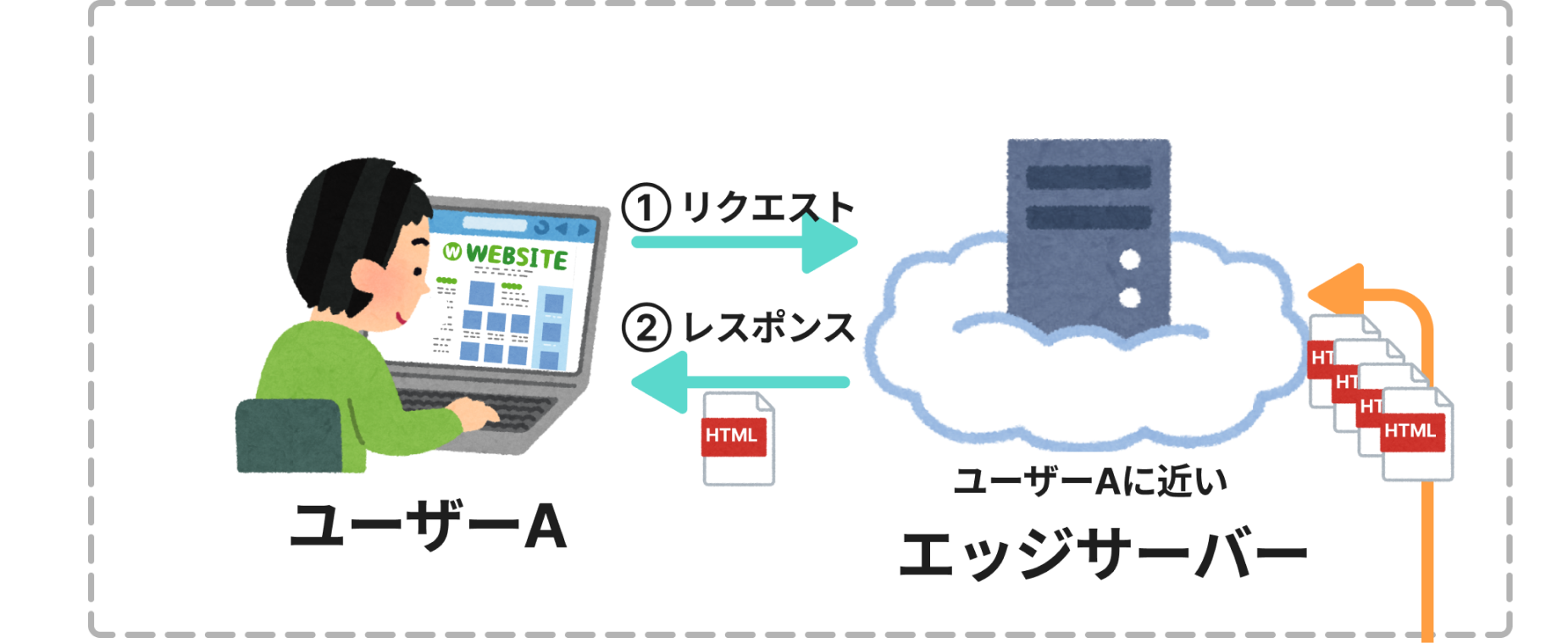 重要なのは点線で囲まれた箇所です。ウェブサイトを閲覧したいユーザーAが、ブラウザでURLを入力すると、ブラウザはCDNの機能によりユーザーAに一番近いサーバーにリクエストを送信することができます(①)。