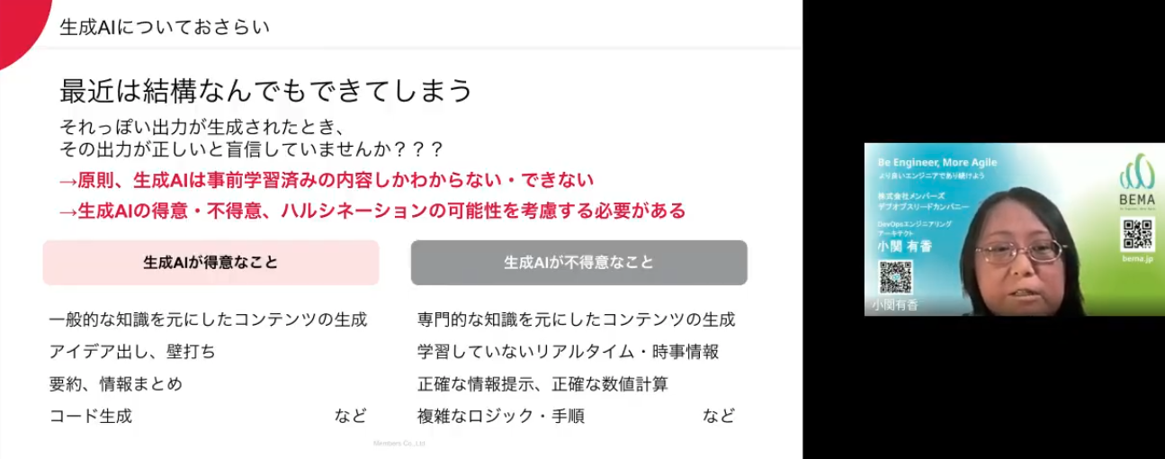 編集部としても、生成AIの得意分野と不得意分野を整理したスライドが印象的です!