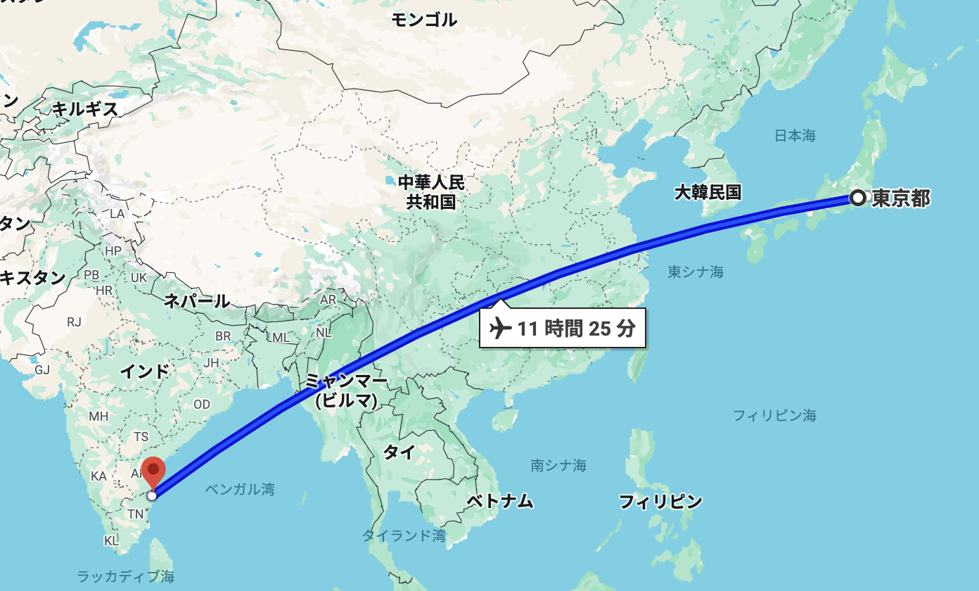 ちなみに、インドへの渡航時間はどれくらいか気になる方もいらっしゃるかもしれないので地図を貼ります。(片道で10時間以上の長い旅でした!)