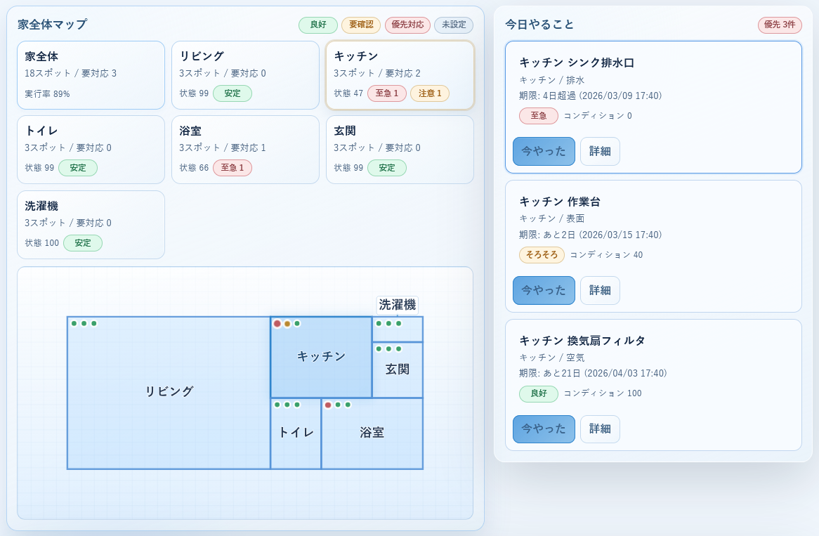 今回開発したアプリは、ズボラな筆者が掃除を習慣化するための掃除管理アプリです。以下の画像のように部屋の間取りが表示されており、それぞれの掃除スポットに掃除の期限を設定することができます。